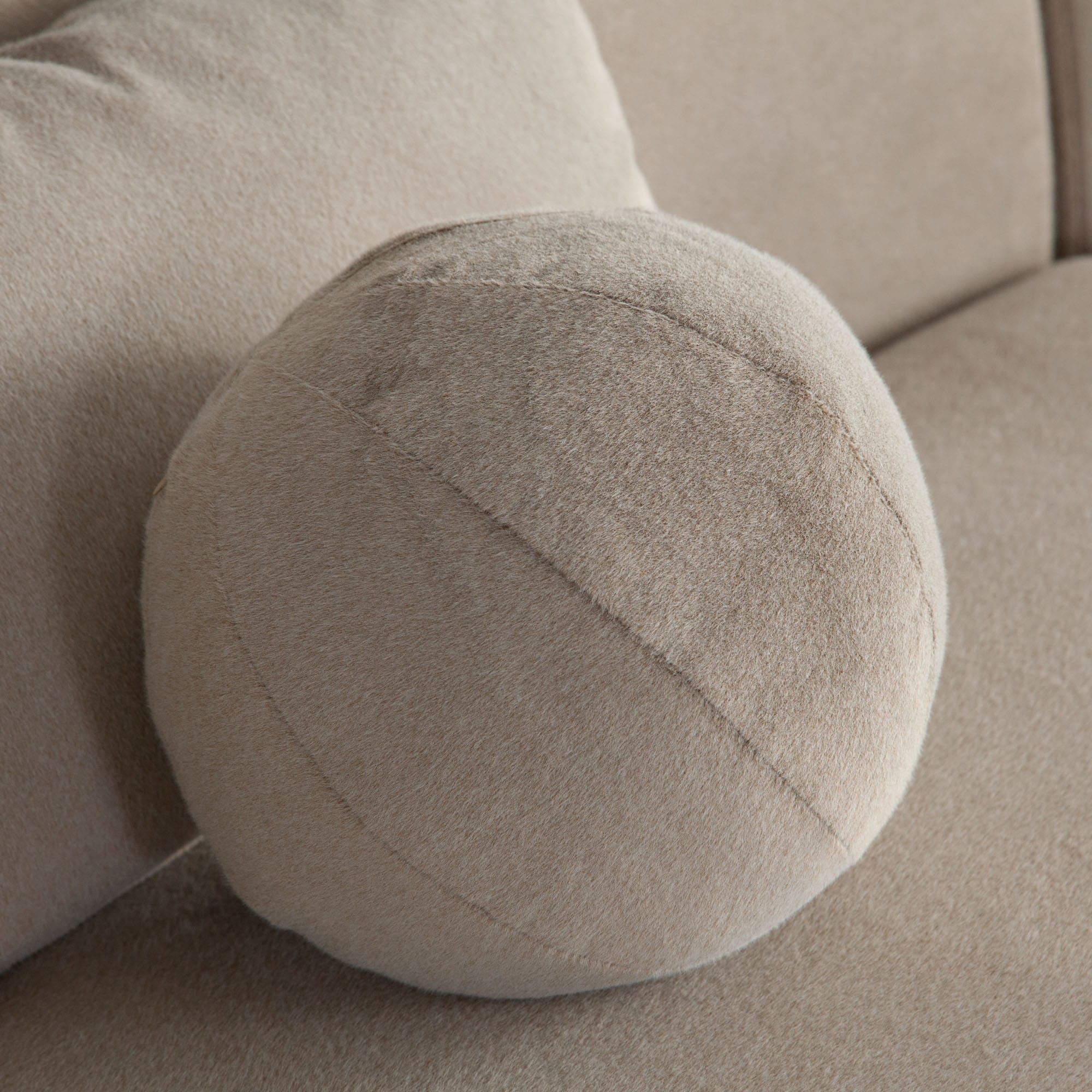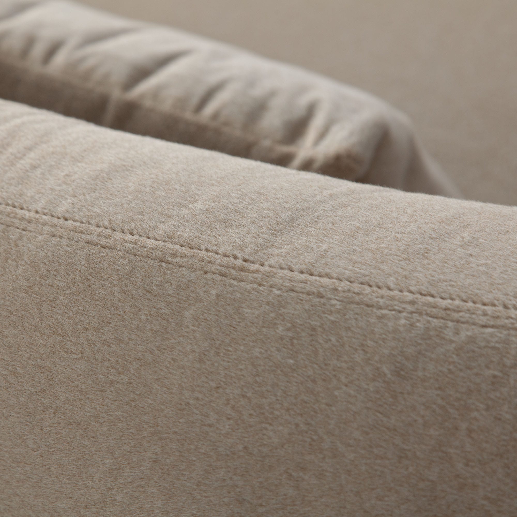 Upholstery: Short-fiber faux Alpaca fabric, selected for a dense, highly textured matte surface.