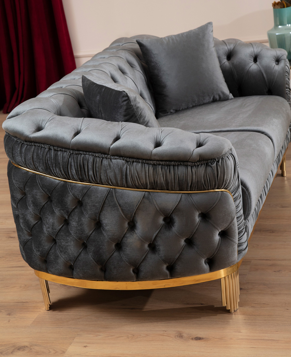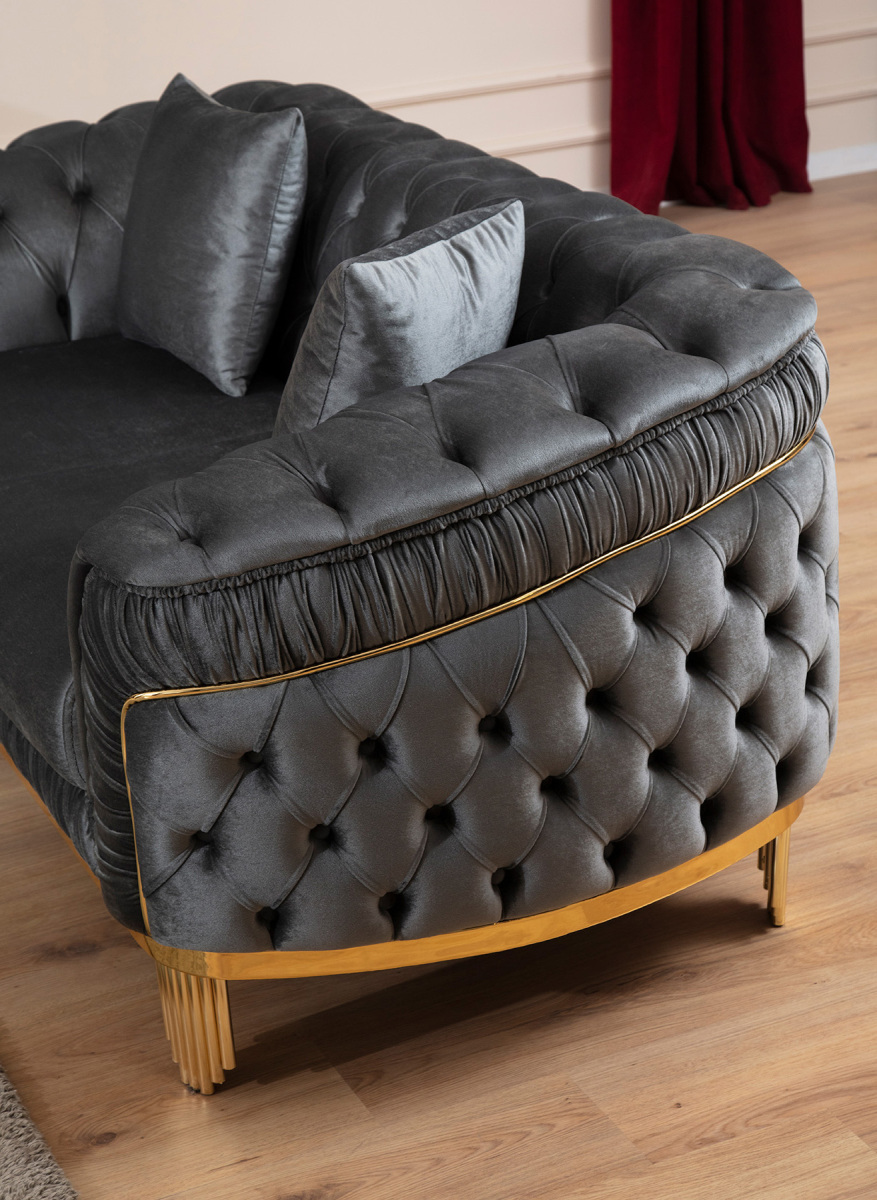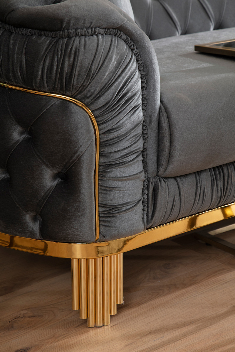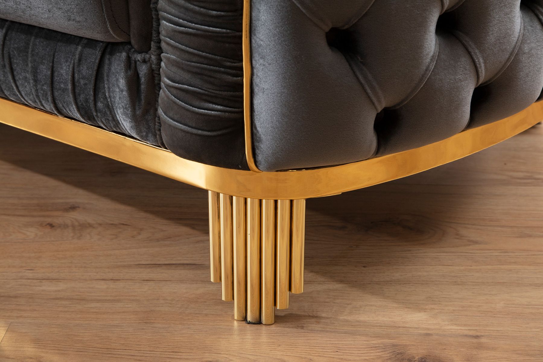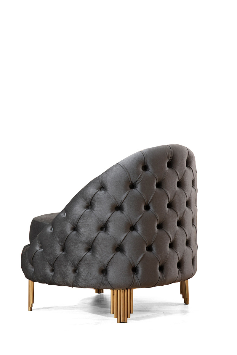 The Delfi features a tufted design with plush fabric, elegant curves, and gold accents. The padded seats, backrests, and armrests offer exceptional support, ensuring both style and comfort.