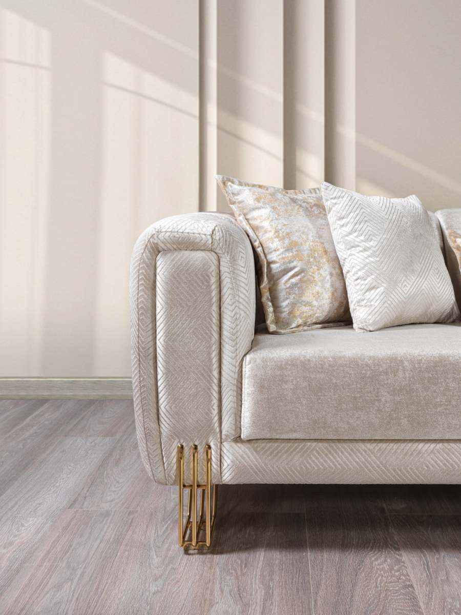 The DIAMOND Living Room Set is a perfect fusion of modern luxury and timeless charm. Featuring plush ivory velvet upholstery and refined gold details, this set instantly elevates any living space with its graceful aesthetic.